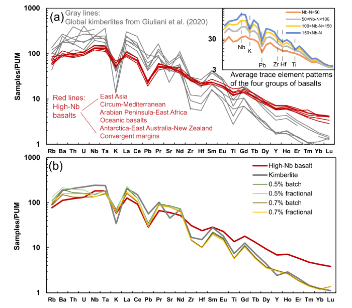 本研究对全球新生代板内玄武岩(图2)数据进行了详细的搜集、整理,发现大洋玄武岩和大陆玄武岩的Sr-Nd-Pd-Hf同位素组成均与熔融程度(本文用Nb含量指示其熔融程度)具有明显的内在联系:地幔高程度部分熔融所形成的低Nb玄武岩(Nb-N<100)具有非常不均一的同位素组成,但是随着熔融程度降低,高Nb玄武岩(Nb-N>100)的同位素组成相对均一(图3)。此外,这些低熔融程度玄武岩同位素组成与之前所定义的“depleted kimberlite source”和PREMA非常类似。本研究还对高Nb玄武岩与金伯利岩的微量元素进行了对比(图4),通过部分熔融模型验证了高Nb玄武岩与金伯利岩代表相同地幔源区(PREMA)在不同压力下熔融(盖层效应)的产物。