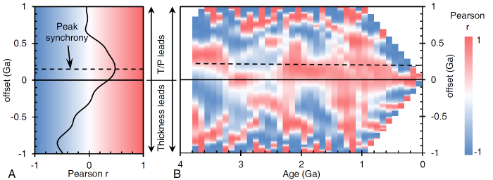 图3 岩石圈厚度与变质热梯度之间的时滞互相关系数(TLCC)(图A)和加窗TLCC(图B)计算结果;用于评估不同时间滞后和特定时间窗口内的相关性,从而深入了解两个变量的潜在因果关系