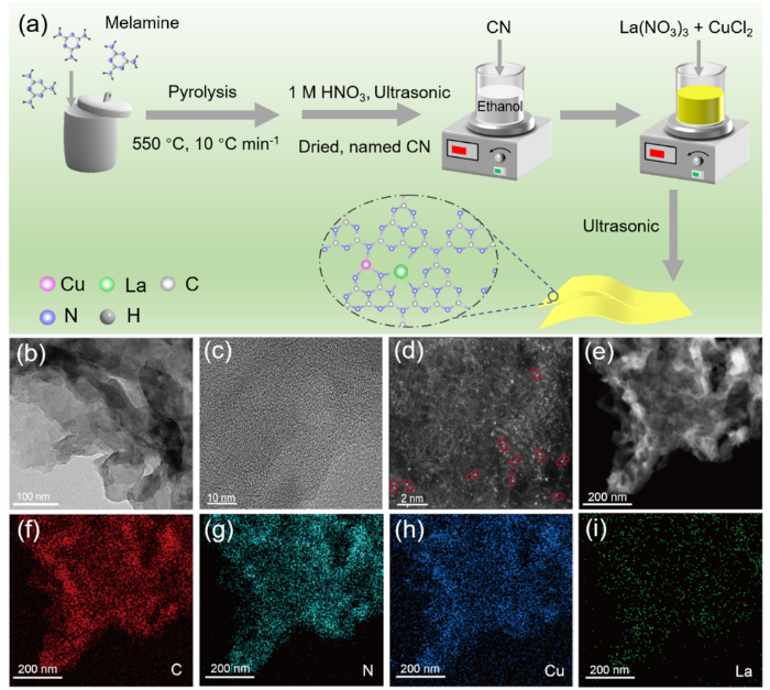 图1 LaCu/CN的制备过程示意图、透射电镜图、球差电镜图和EDS图