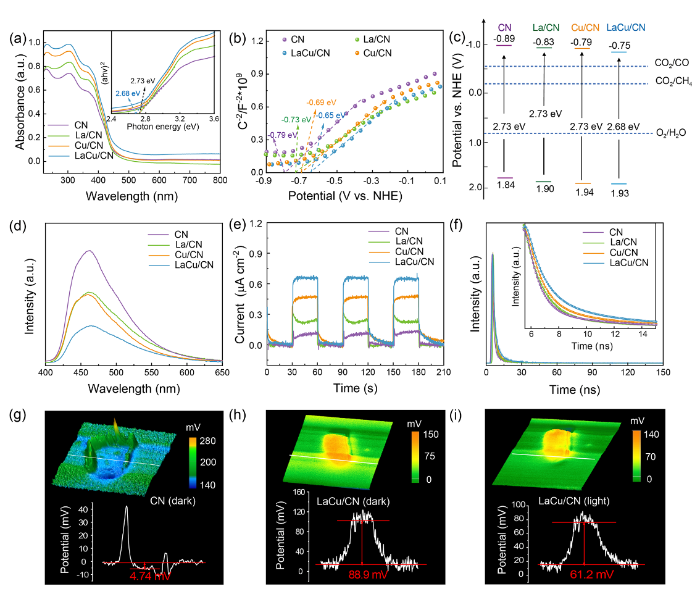 3. 原位开尔文探针力显微镜(KPFM)显示具有原子级Cu-N-La给-受体结构的催化剂的光生电子更有利于在表面聚集。