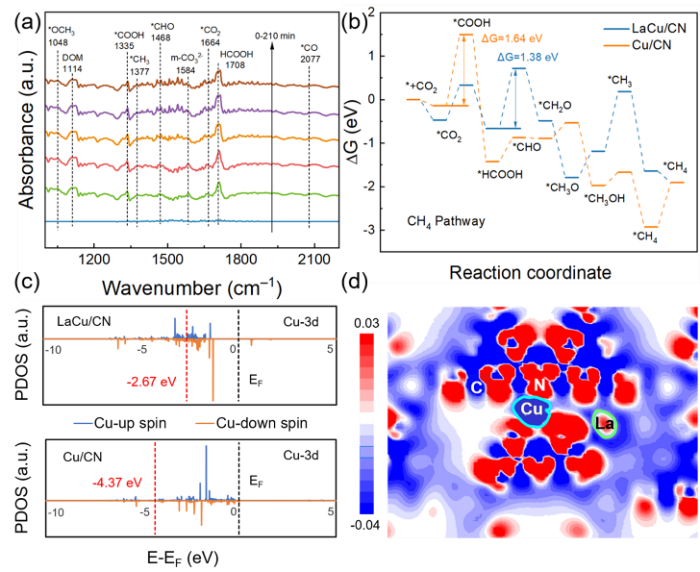 4. 第一性原理计算(DFT)理论计算证明原子级Cu-N-La给-受体结构同时改变了Cu单原子的配位环境和电子环境,从而实现反应中间体吸附能的调制,满足靶向光催化CO2还原为CH4的要求。