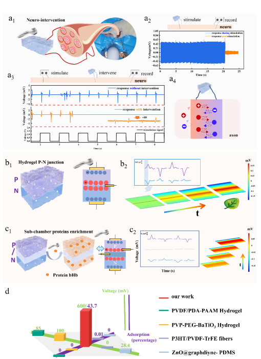 生物体中的电场对组织生长、物质传输、分子转化等各种过程起着重要的作用,在组织修复、功能调节等生物材料中引入压电活性改变电场,是制备高性能生物材料的重要途径。水凝胶作为具有仿生材料,广泛应用于组织工程、模拟器官、医疗等领域。然而,在生物相容性离子环境中的水凝胶发电仍然具有挑战性。另外,作为组织工程或医疗材料,它们通常采用与生物机体相异的离子种类,存在生物相容性风险。在这些发电机中获得的低于100 mV的电压不足以触发神经反应。此外,物质交换在生物环境中普遍存在,在组织工程基质中具有重要意义,但先前开发的离子发生器在提供丰富的物质交换方面存在缺陷。