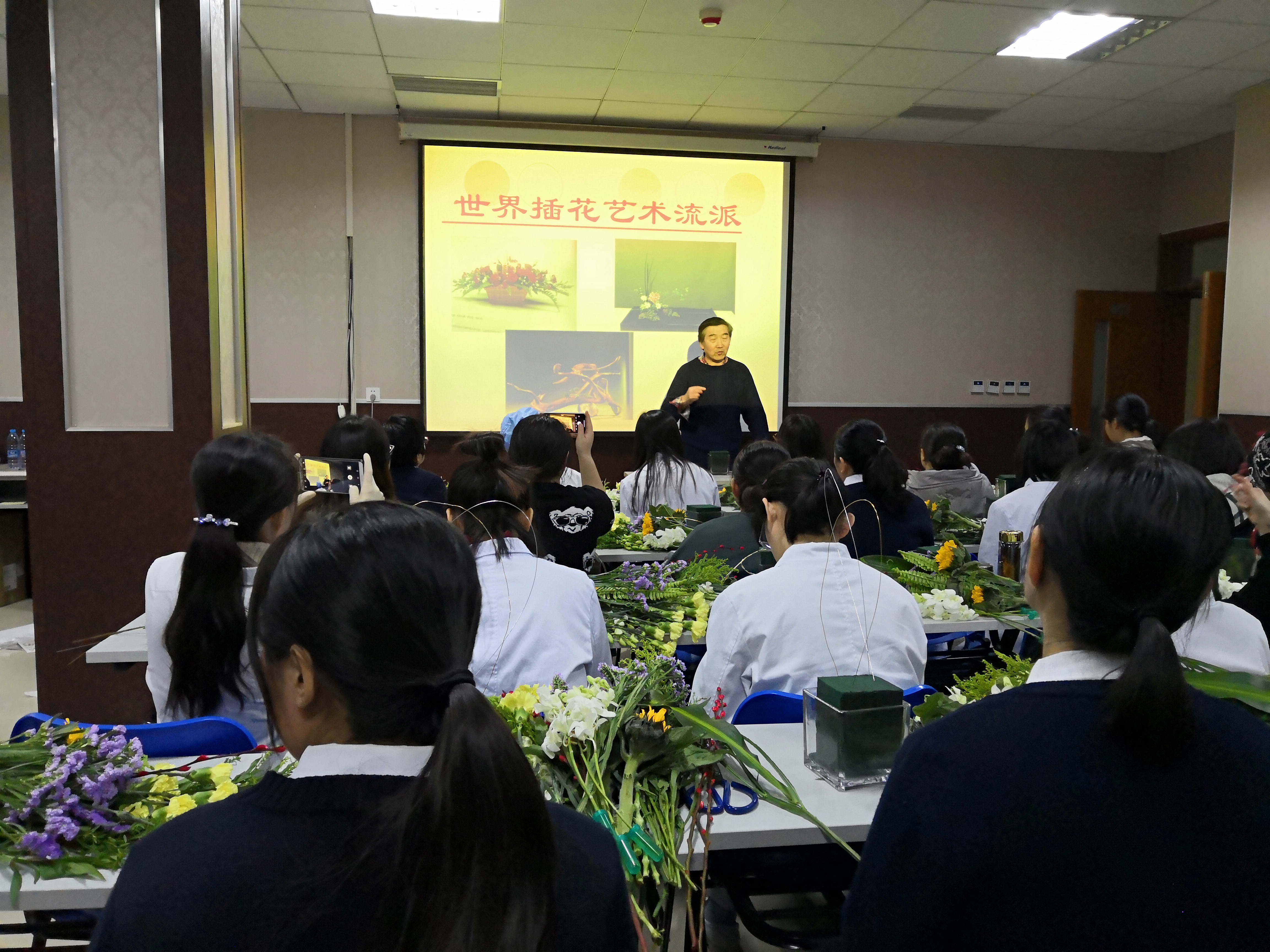 本次插花活动,很荣幸地邀请到北京林业大学园艺系冯教授,他通过图片为大家介绍了传统与现代、中式与西式、宫廷与民间的花卉插花艺术及插花的基本要求。通过了解更多的花卉知识,才能插出一盆优雅、具有个人特色的花!