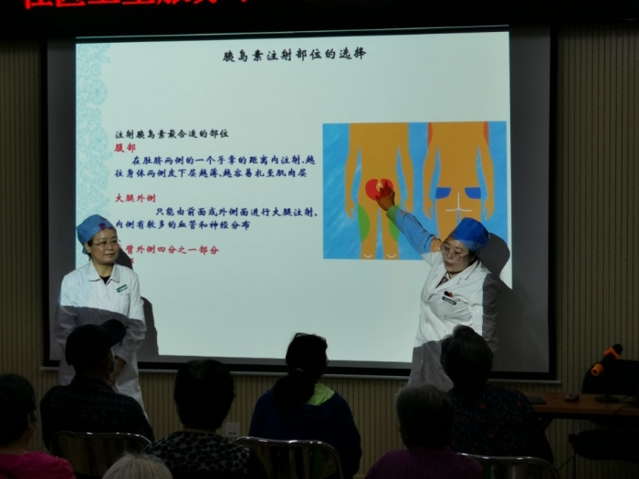 王淼护士讲授了《胰岛素使用的相关注意事项》,详细讲解了胰岛素针的装备使用方法,如何注射、如何保存等注意事项。