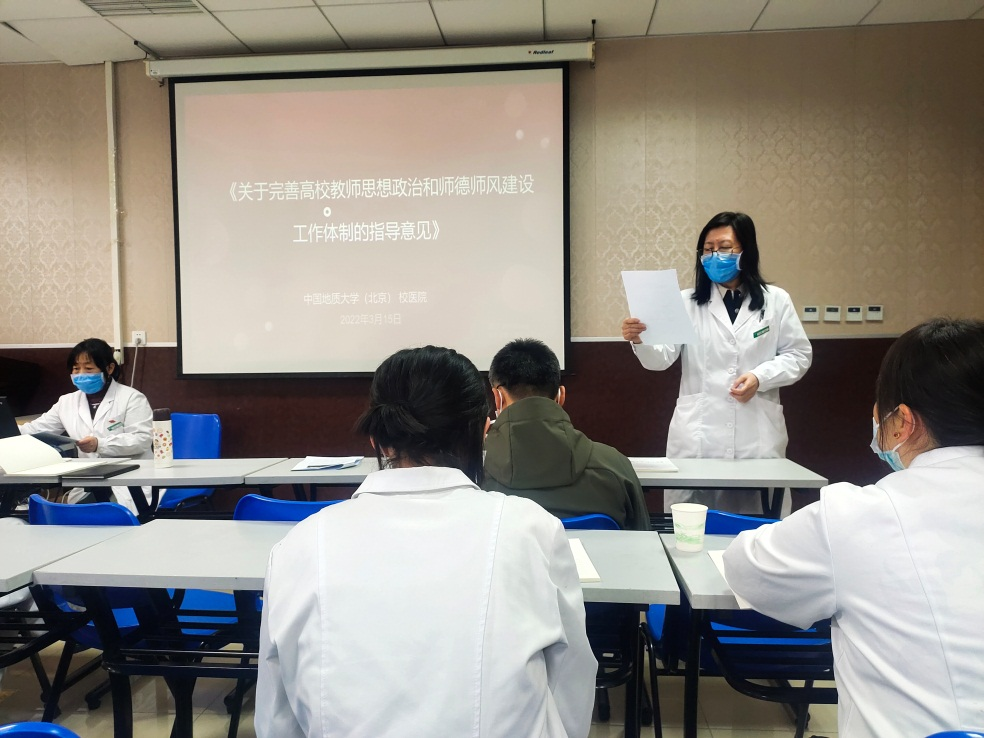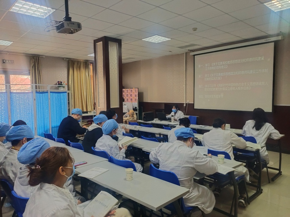 首先由刘淑芳代表校医院直属党支部书记、教师工作委员会主任胡英宣布:根据学校党委教师工作委员会要求,校医院成立了校医院直属党支部教师工作委员会,制定了《校医院校医院直属党支部教师工作分委员会议事规则》和职工思想政治学习计划,建立了《校医院教师思想政治和师德师风建设工作制度》,校医院直属党支部教师工作委员会定期组织开展教师政治理论学习。并于3月10日召开了第一次教师工作委员会,严格学习制度,完善师德日常纪实档案,规范师德年度考核工作,师德师风与医德医风并存。师德考核不合格教职工,年度考核不合格。