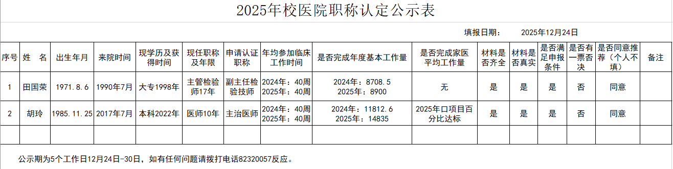 2025年12月24日校医院召开了2025年度职称评审推荐会议,经校医院职称评聘工作领导小组成员无记名投票表决,同意推荐田国荣、胡玲同志参加2025年度学校职称评审,特此公示。