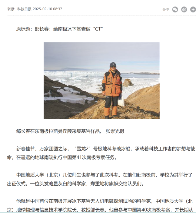 科技日报报道2 024年邹长春院长在南极开展首次无人机电磁探测