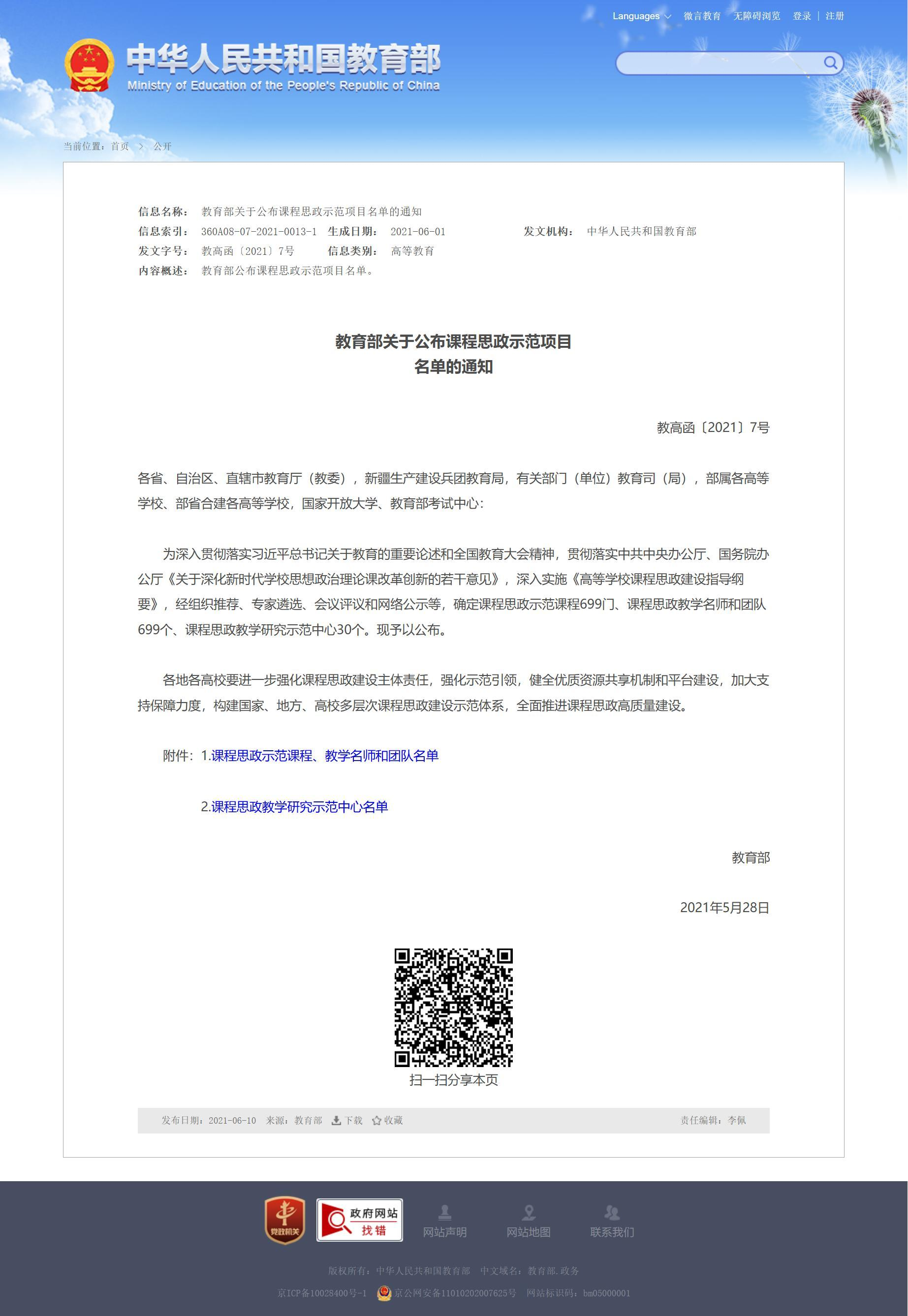 2.教育部课程思政示范课程、教学名师和团队等3项