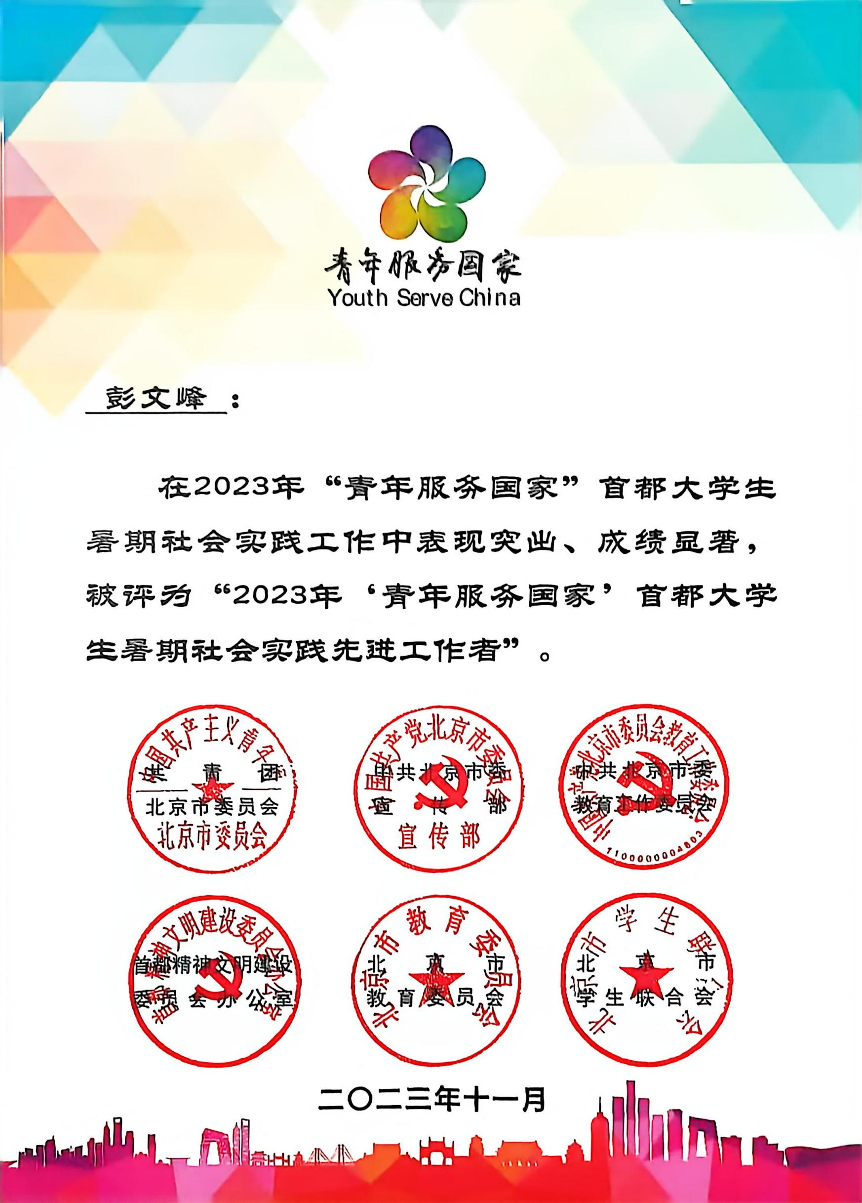 彭文峰——北京市青年服务国家社会实践先进工作者