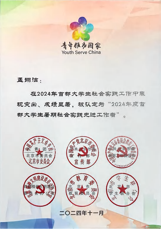 孟翊洁——北京青年服务国家社会实践先进工作者