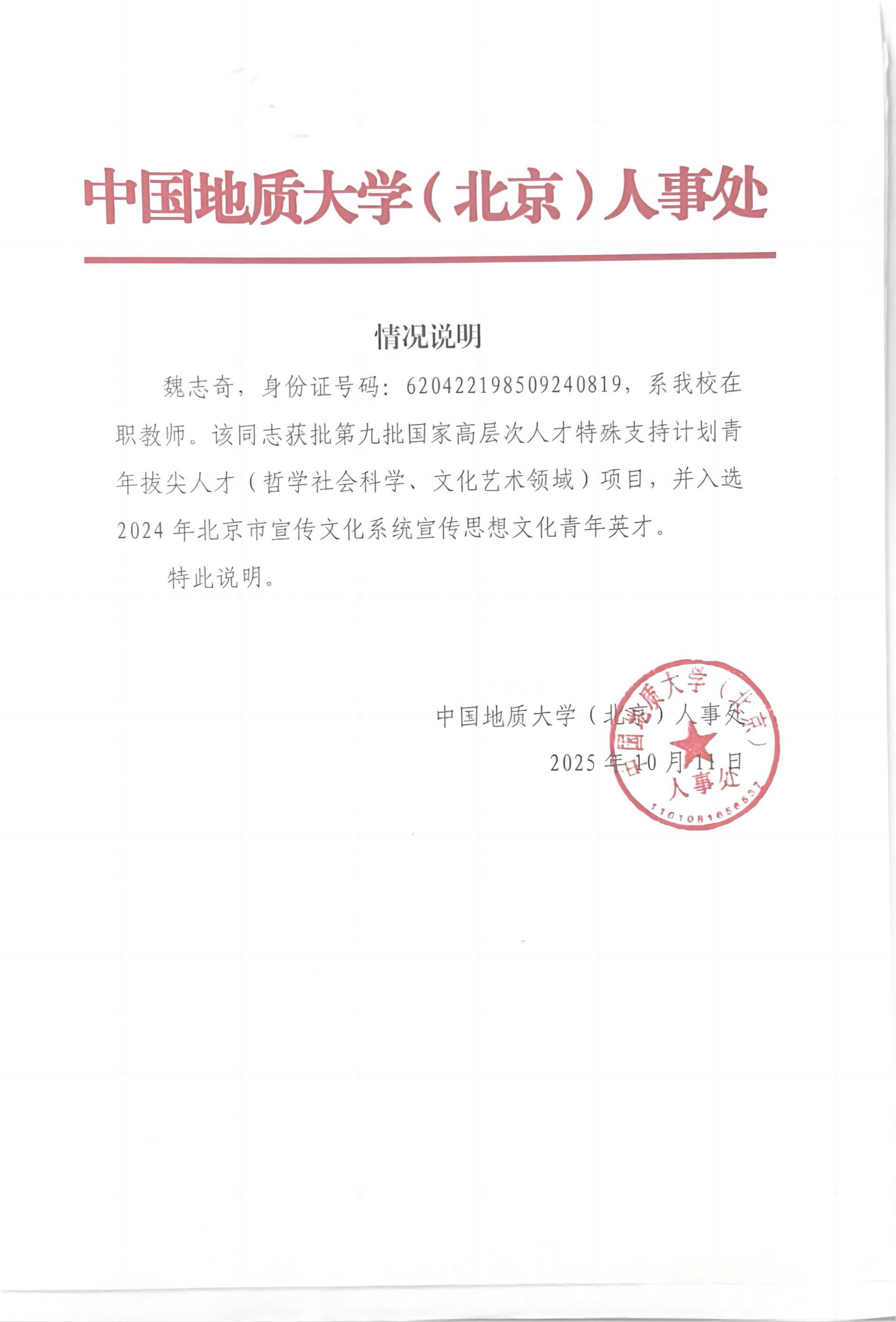 1.国家万人计划青年拔尖人才、北京市宣传文化青年英才(魏志奇)