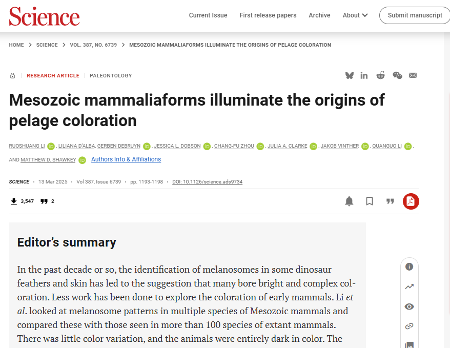 1 | 李若霜 | Mesozoic mammaliaforms illuminate the origins of pelage coloration | Science | 2025年03月 | https://www.science.org/doi/10.1126/science.ads9734 |