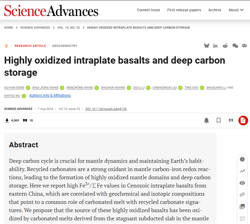 2 | 董栩含 | Highly oxidized intraplate basalts and deep carbon storage | Science Advances | 2024年08月 | https://doi.org/10.1126/sciadv.adm8138 |