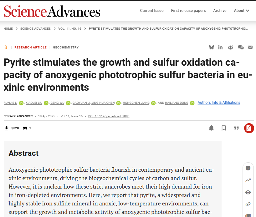 3 | 李润洁 | Pyrite stimulates the growth and sulfur oxidation capacity of anoxygenic phototrophic sulfur bacteria in euxinic environments | Science Advances | 2025年04月 | https://www.science.org/doi/10.1126/sciadv.adu7080 |
