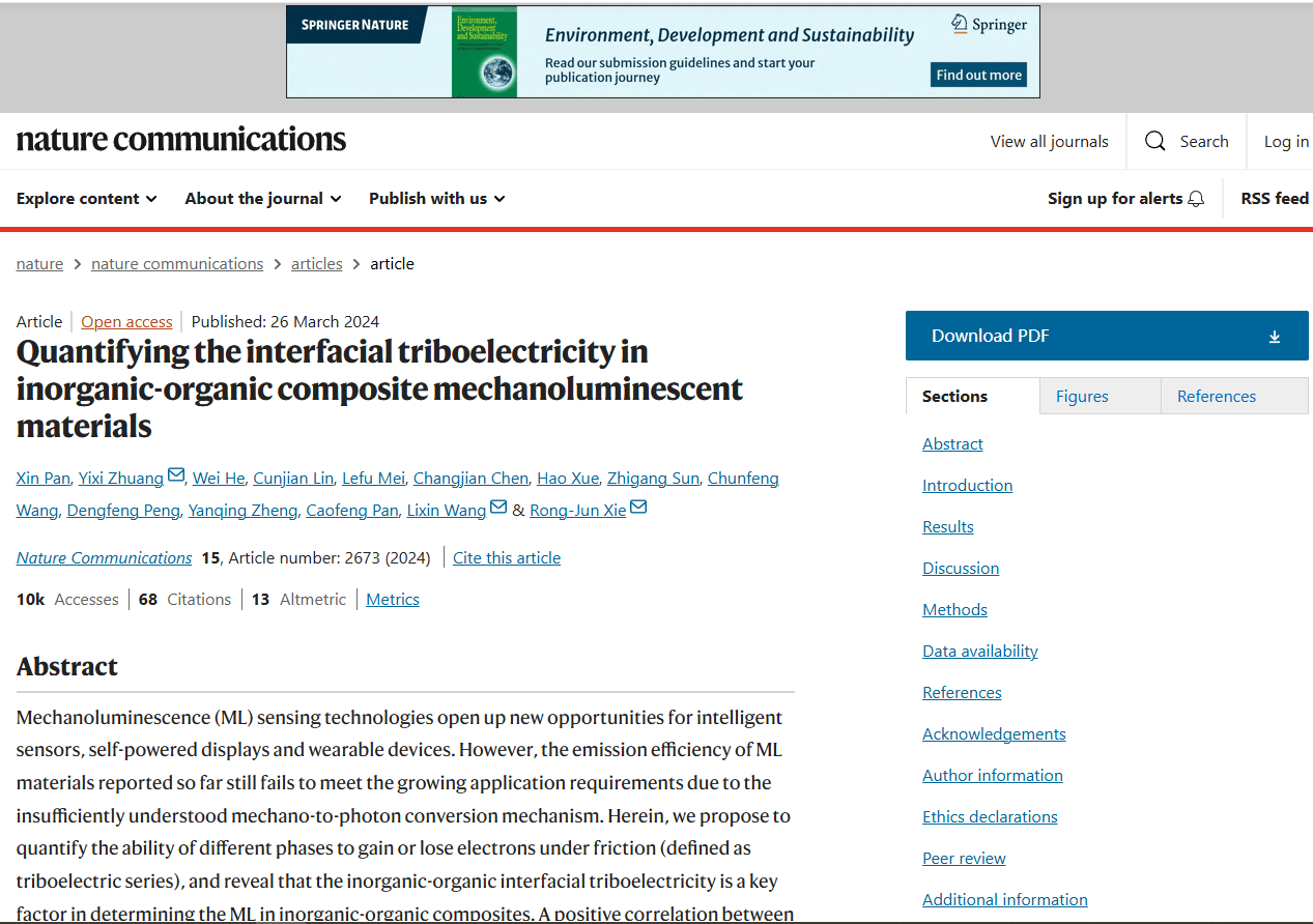 4 | 潘鑫 | Quantifying the interfacial triboelectricity in inorganic-organic composite mechanoluminescent materials | Nature Communications | 2024年 03月 | https://doi.org/10.1038/s41467-024-46900-w |