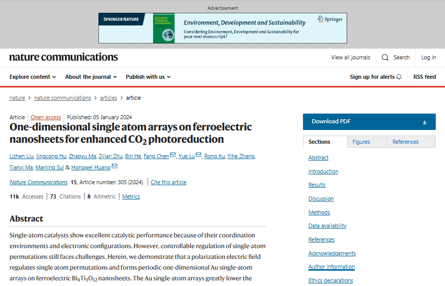 5 | 刘丽珍 | One-dimensional single atom arrays on ferroelectric nanosheets for enhanced CO2 photoreduction | Nature Communications | 2024年 01月 | https://www.nature.com/articles/s41467-023-44493-4 |