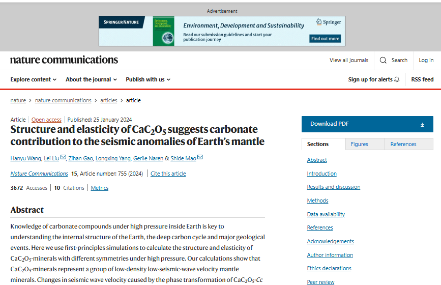 6 | 王翰宇 | Structure and elasticity of CaC2O5 suggests carbonate contribution to the seismic anomalies of Earths mantle | Nature Communications | 2024年 01月 | https://www.nature.com/articles/s41467-024-44925-9 |