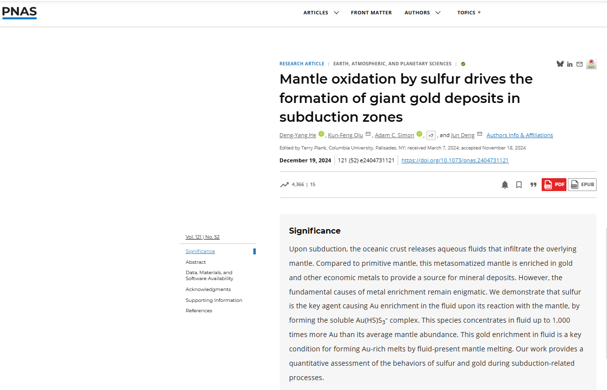 7 | 何登洋 | Mantle oxidation by sulfur drives the formation of giant gold deposits in subduction zones | Proceedings of The National Academy of Sciences of The United States of America | 2024年 12月 | https://www.pnas.org/doi/abs/10.1073/pnas.2404731121 |