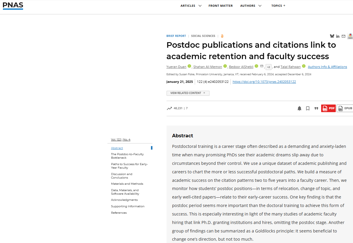 8 | 段月然 | Postdoc publications and citations link to academic retention and faculty success | Proceedings of The National Academy of Sciences of The United States of America | 2025年 01月 | https://www.pnas.org/doi/10.1073/pnas.2402053122 |