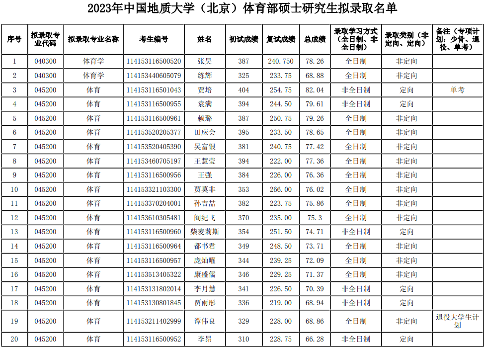 2023年中国地质大学(北京)体育部硕士研究生一志愿拟录取名单