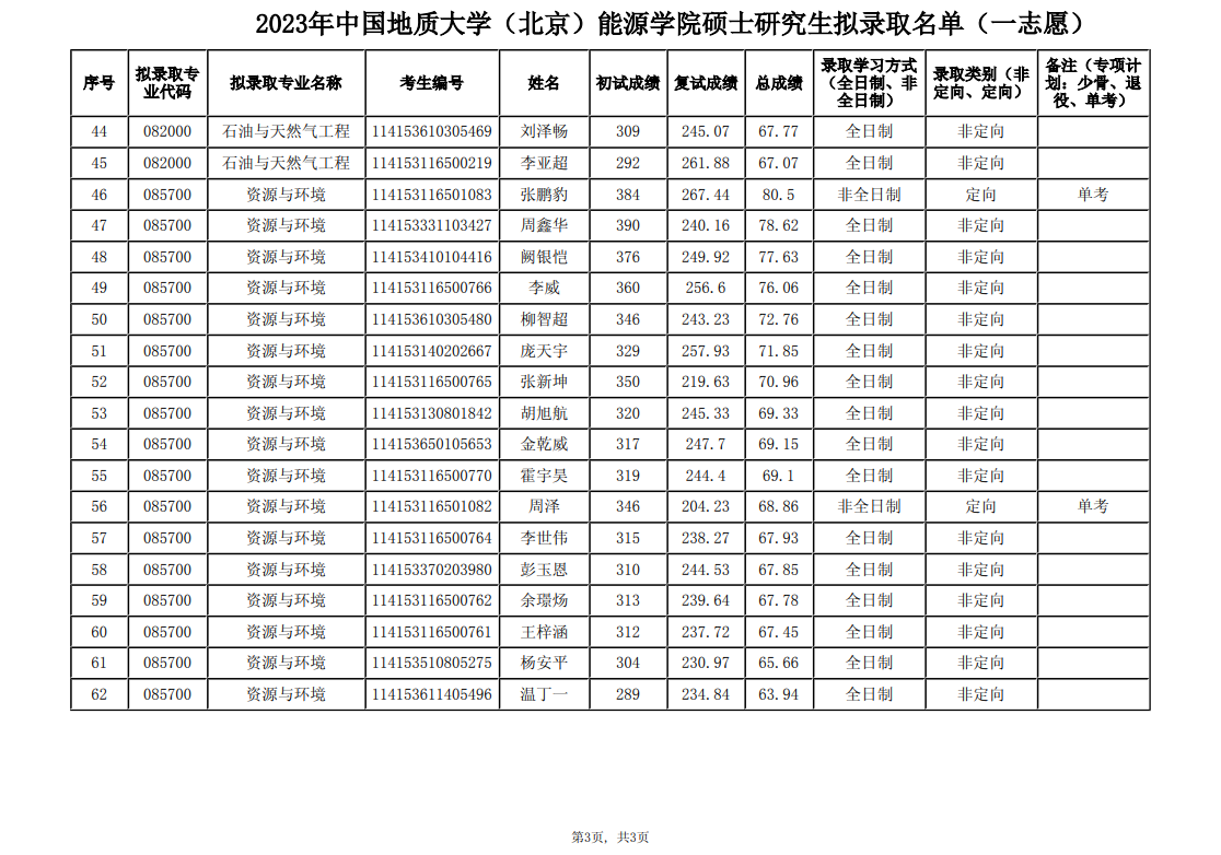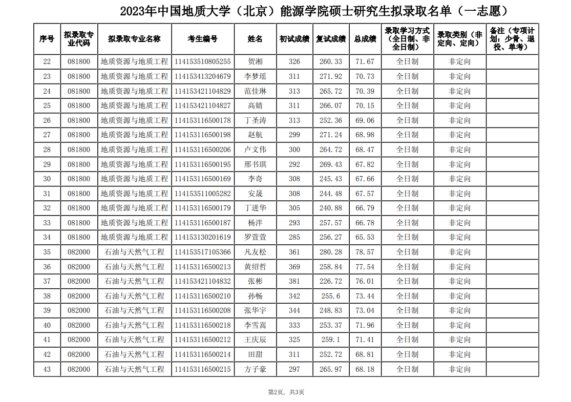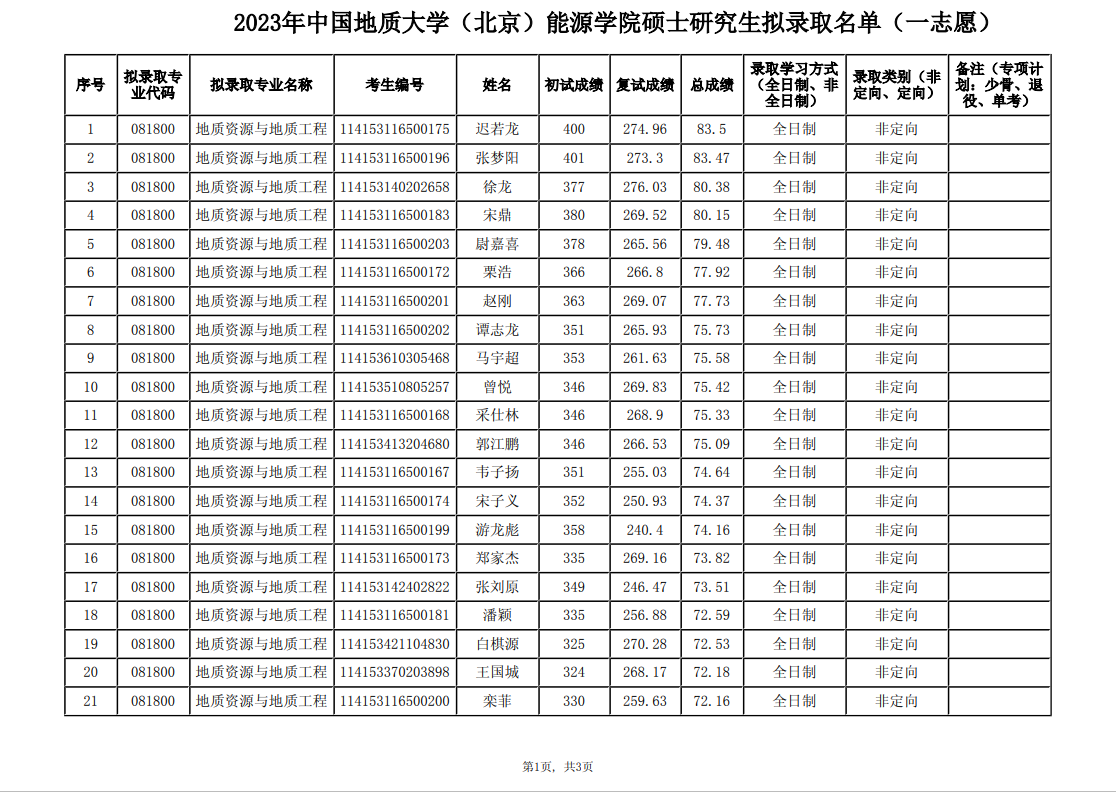 2023中国地质大学(北京)能源学院硕士研究生拟录取名单(一志愿)